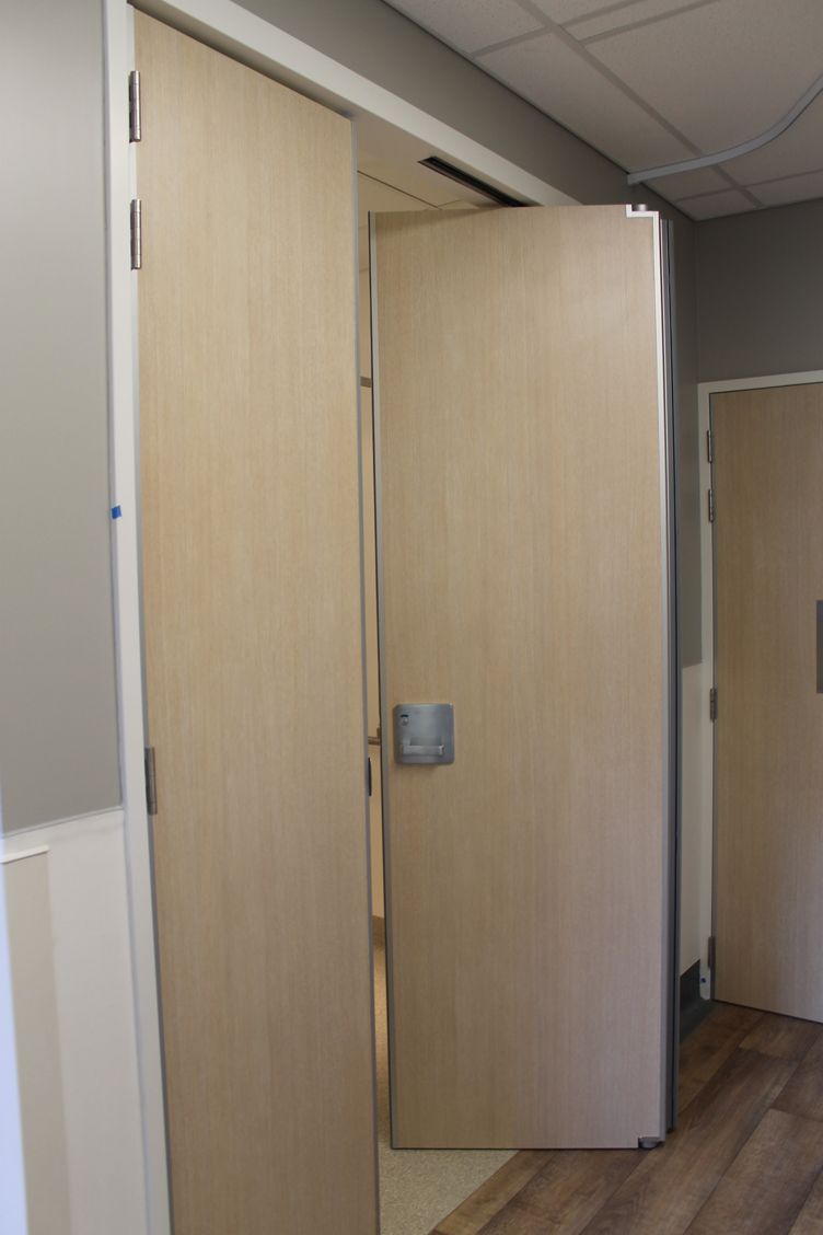 The door set consists of solid-core flush-panel door leaves mounted in a steel frame.